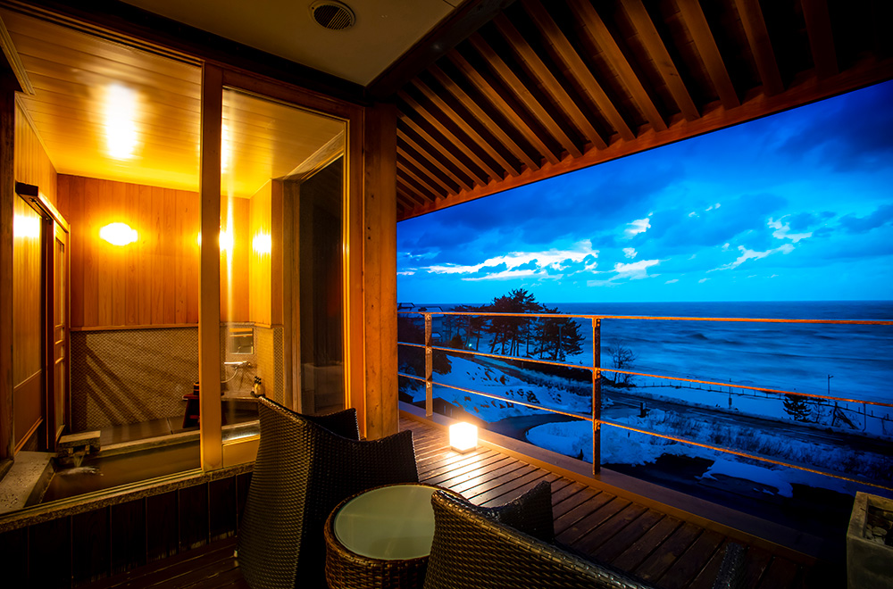 海の京都“天地山海の和の源流”の「天-ten」と名付けられた2階客室は「紫」を基調とした和モダンな設え。日本海が一望できる露天風呂と専用のウッドデッキのテラスを兼ね備えた60平米の和モダンリビング客室で、大切な人と過ごす丹後のひと時を心行くまでお楽しみ下さい。